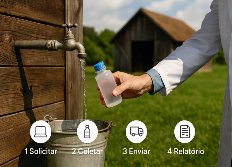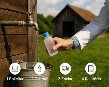 Coleta guiada na torneira ou bebedouro, com frasco estéril e rótulo QR-Code para rastreio.